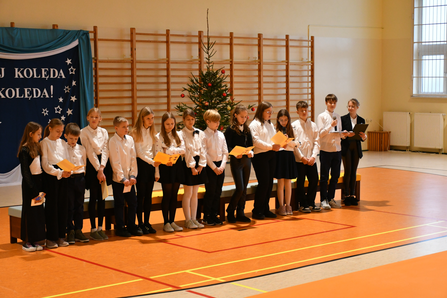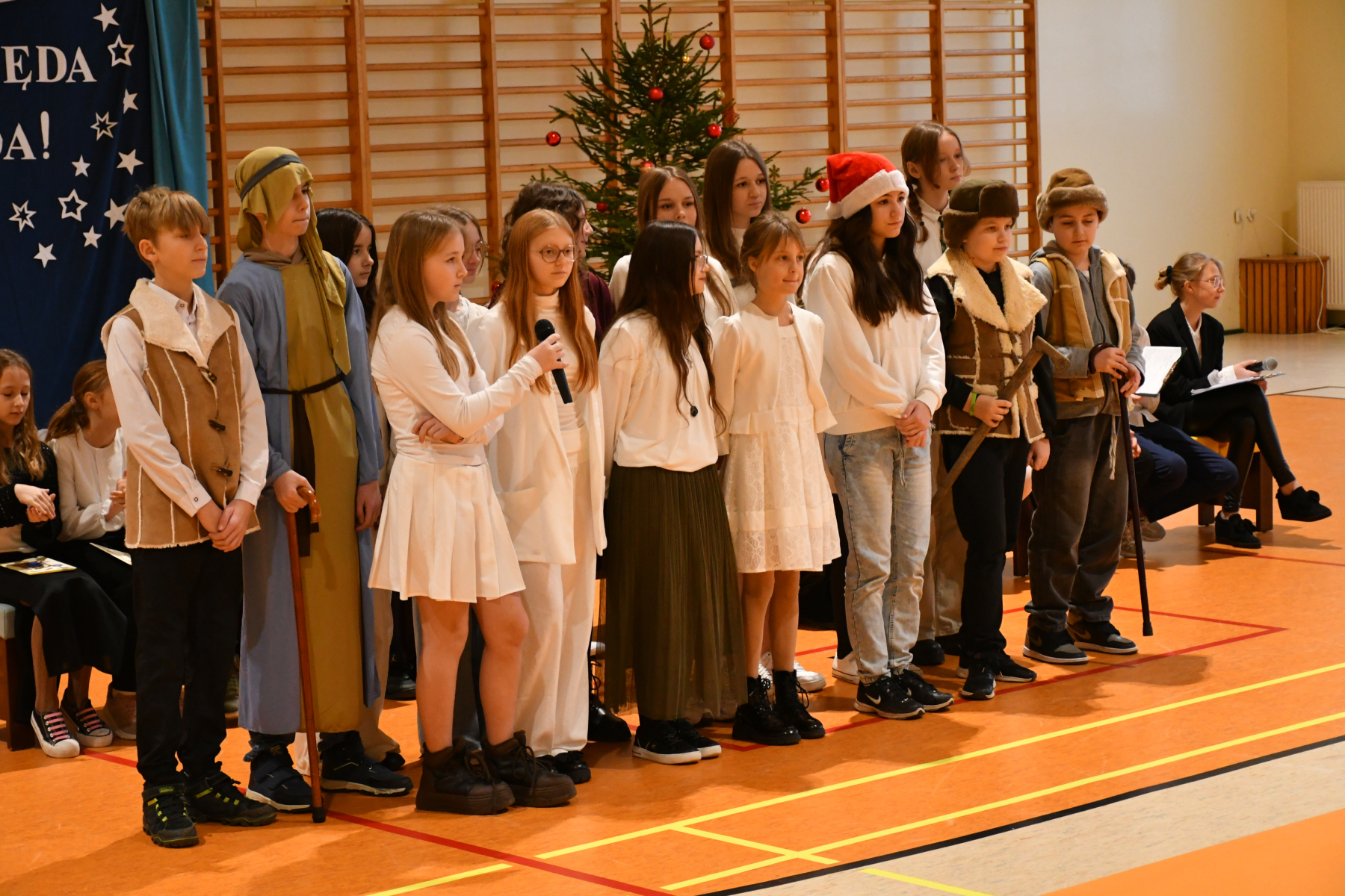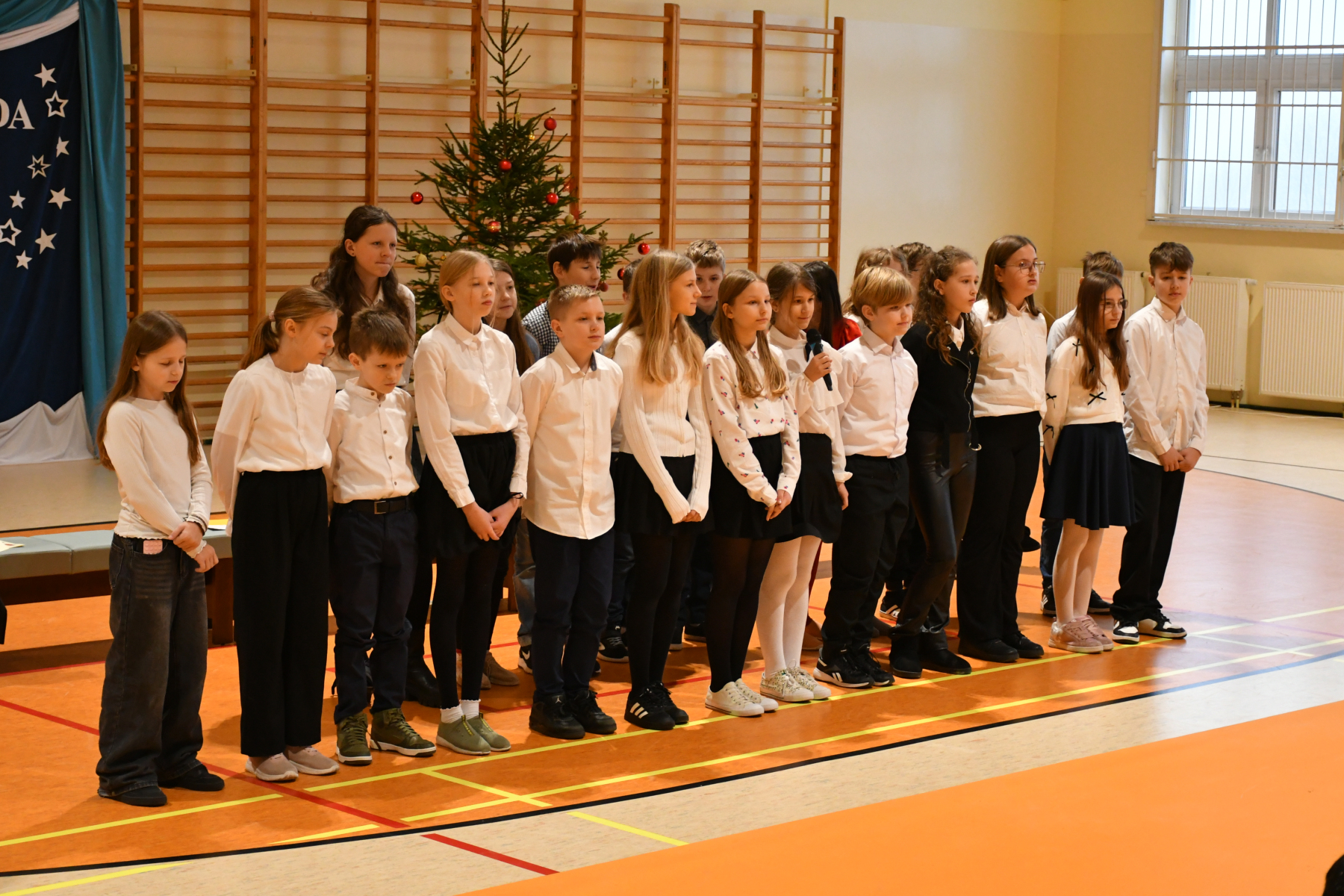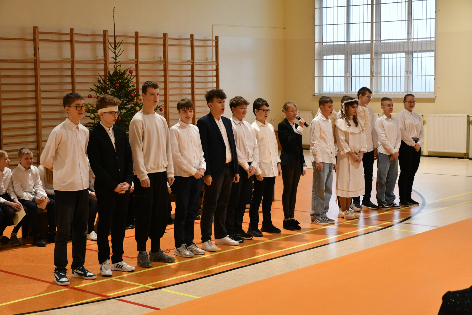 19 grudnia w naszej szkole odbyło się uroczyste spotkanie wigilijne, które zgromadziło Dyrekcję, Grono Pedagogiczne, rodziców, uczniów oraz zaproszonych gości. Pani Bożena Urban z uczniami klas V i VII wprowadziła nas w świąteczny nastrój. Dodatkowo, każda klasa zaśpiewała wybraną kolędę lub pastorałkę. Spotkanie zakończyliśmy życzeniami i łamaniem się opłatkiem.
